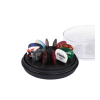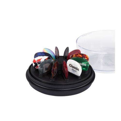 The D’Addario Pick Holder 360 is a fun, simple way to organize 12 of your favorite picks, so they’re always visible and within reach. The rotating platform features a smooth, ball-bearing design, allowing quick access to your favorite picks. Meanwhile, the clear lid doubles as a stand and extra pick storage space. For single-handed pick removal, place your index finger on the center hub and remove the pick with your thumb and middle finger. Also great for displaying collectable picks! Note: Picks are sold separately. Recommended for picks up to 2mm thick; picks over 2mm may not fit properly.