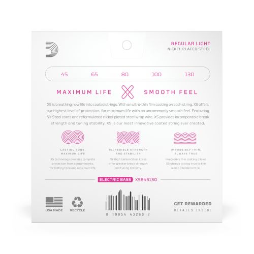 XS Nickel Bass strings combine a premium nickel-plated wrap wire with an ultra-thin coating for a smooth feel, extended life, and punchy, balanced tone.