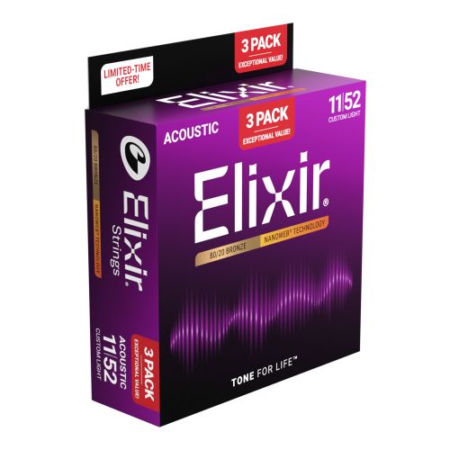 Elixir 3 pack 11027 80/20 bronze Elixir® Acoustic 80/20 Bronze Strings with NANOWEB Coating deliver a bright, lively tone together with extended tone life that players have come to expect from Elixir Strings.