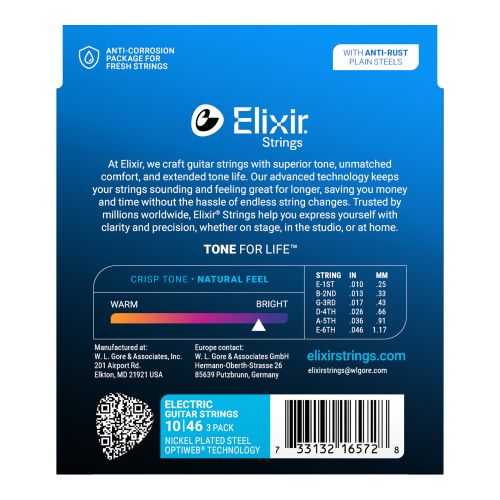 Elixir® Electric Nickel Plated Steel Strings with OPTIWEB Coating give you the performance of a natural string—that crisp tone, natural feel and playable grip you know and love—without sacrificing the signature long-lasting tone life of Elixir Strings.