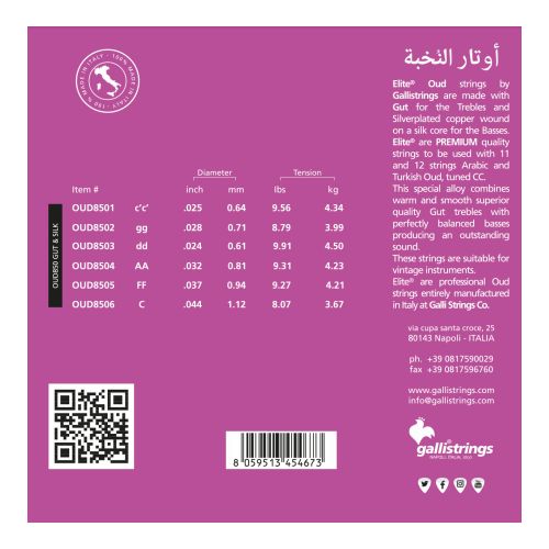 Elite® Oud strings by Gallistrings are made with Gut for the Trebles and Silverplated copper wound on a silk core for the Basses. Elite® are PREMIUM quality strings to be used with 11 and 12 strings Arabic and Turkish Oud, tuned CC.