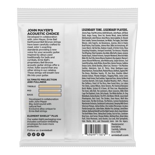 Developed in collaboration with John Mayer, Ernie Ball Earthwood Bell Bronze strings have been carefully crafted to meet John's exacting standards, providing a new voice for your acoustic guitar. Inspired by alloys used traditionally for bells and cymbals, Ernie Ball's proprietary Bell Bronze acoustic guitar strings offer a richer, fuller sound than any other string in our catalog. These strings will breathe new life into your guitar! Gauges .010, .014 .020w, .028, .040, .050