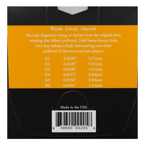 Gold low tension set snaren voor klassieke gitaar, lage spanning. Dit zijn de originele gitaarsnaren van Augustine, een intrinsiek onderdeel van de klassieke gitaarrevolutie van deze eeuw. Albert Augustine, een instrumentmaker, werd door niemand minder dan Andres Segovia onder druk gezet om nylon gitaarsnaren te gaan produceren en verkopen. Hij deed dit en hiermee verzekerde hij de opkomst van een nieuwe generatie concertspelers en zijn eigen aandeel in de cultivatie en voltooiing van de beroemde Segovia Sound.